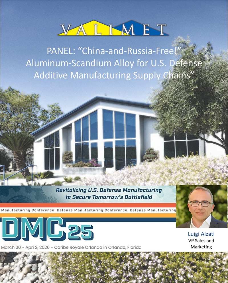 VALIMET has been invited to participate in a panel discussion at the Defense Manufacturing Conference (DMC), focused on Aluminum–Scandium alloys – particularly in light of emerging domestic sourcing of Scandium.
